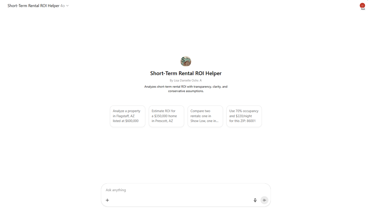 With STR Analyzer Pro, we’re testing how far a GPT can go in helping you evaluate short-term rental properties. It estimates revenue, fills in missing data, and calculates ROI — all while asking smart follow-up questions. The goal? To explore what AI-powered investing support might look like in everyday decisions.