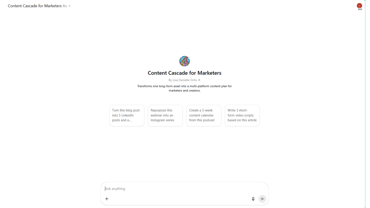 This GPT explores whether a single piece of long-form content can spark an entire marketing strategy — without constant prompting. Content Cascade takes your blog, podcast, or webinar and turns it into platform-specific posts, emails, and video scripts. It’s a small step toward agentic creative workflows, and a fun one to try.